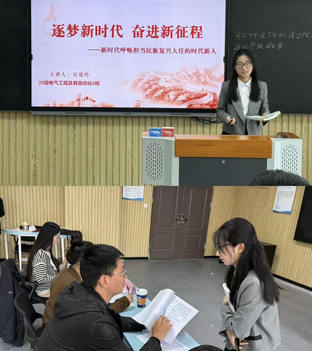 为深入学习贯彻落实全国、全省教育大会精神,深化思政课改革创新,推进“大思政课”建设,必赢565net官网于2025年10月21日在一教211组织开展第四届“大员工讲思政课”大赛院级比赛。院书记助理邓金鑫、辅导员贺沙沙、刘鸿飞、刘萍萍四位老师出席并担任本次赛事评委。