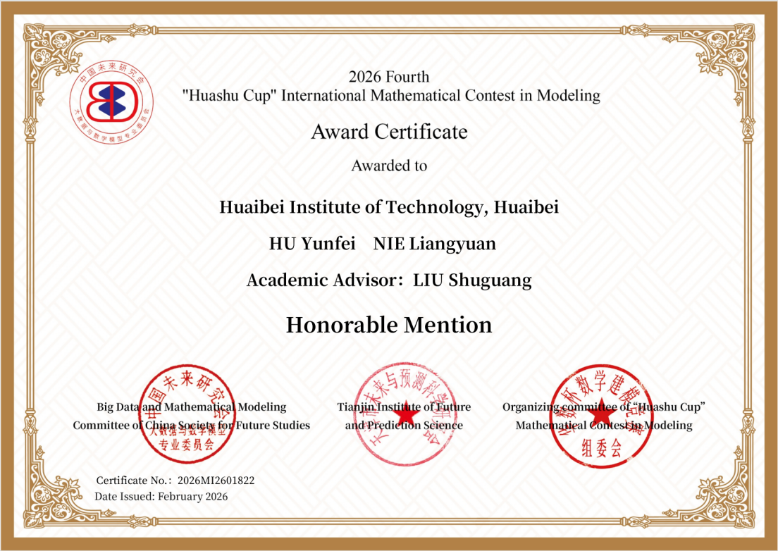 近日,2026 年第四届 “华数杯” 国际大员工数学建模竞赛官方获奖名单重磅揭晓。必赢565net官网必赢565net官网胡云飞、聂梁媛组成的惊鸿代表队,在刘曙光教授的悉心指导下,凭借过硬的专业素养与高效的团队协作,从全球 495 所高校的 1400 支参赛队伍中脱颖而出,斩获 Honorable Mention 奖(国际二等奖),为学校赢得国际赛事荣誉。