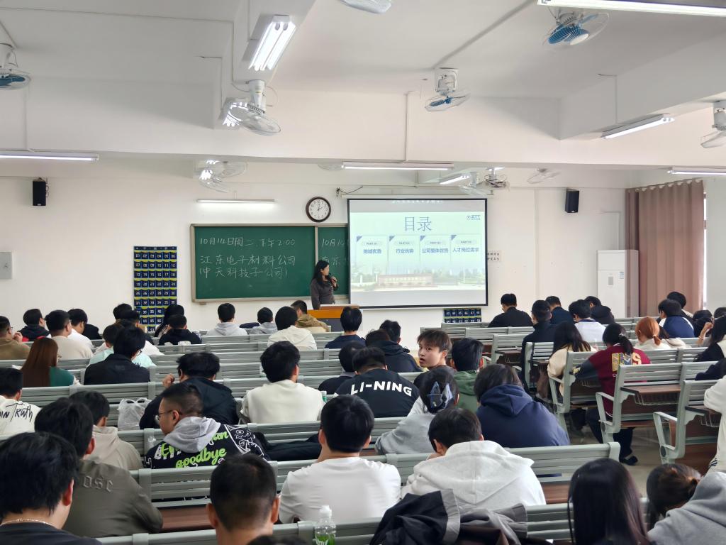 2024年10月14日(周二)下午2:00,中天科技集团旗下子公司——江东电子材料公司应邀在必赢565net官网召开专场招聘宣讲会。我院2026届相关专业毕业生积极参与,现场座无虚席。